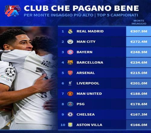 本賽季五大聯(lián)賽球隊(duì)工資TOP20:皇馬超3億歐第1,曼城第2