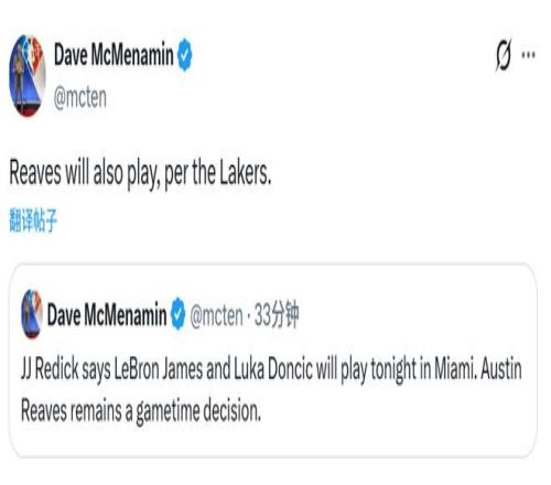 北京時間3月20日,湖人官方宣布,詹姆斯(左腳關節(jié)炎)、東契奇(右髖酸痛)都已經(jīng)升級為可以出戰(zhàn),將出戰(zhàn)今日對熱火的背靠背比賽。此前他倆和里夫斯都被列為出戰(zhàn)成疑的狀態(tài),里夫斯(右臂挫傷)經(jīng)過賽前評估后,也確定出戰(zhàn)熱火。