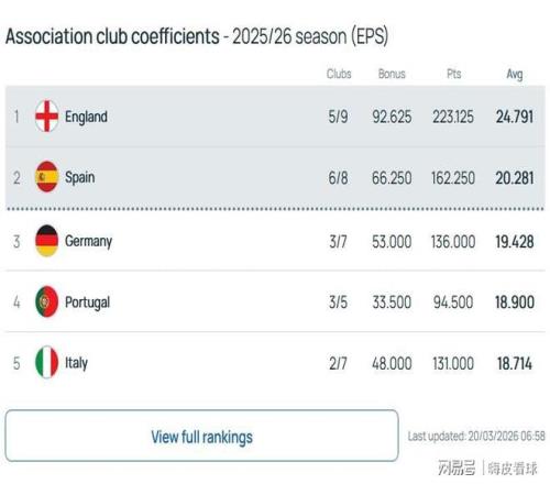 大家比較關(guān)心的歐洲聯(lián)賽排名,根據(jù)歐足聯(lián)公布的最新積分榜,英超在歐冠表現(xiàn)不佳,剩下兩個杯賽還不錯,領(lǐng)先優(yōu)勢從5分,只是縮小到4.5分。西甲6隊在16強(qiáng)全部晉級,已經(jīng)反超德甲,并且拉開了將近0.8分的差距。葡超3隊同樣在16強(qiáng)全部晉級,超越了意甲,上升到第四名,只能說,亞平寧足球真的沒落了,意大利國家隊下周參加附加賽,會不會連續(xù)三屆無緣世界杯呢?