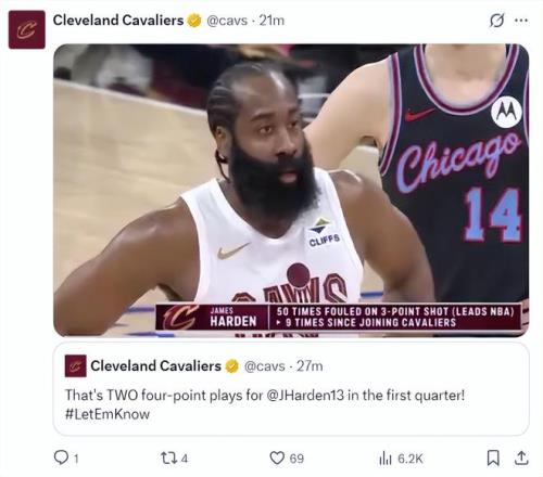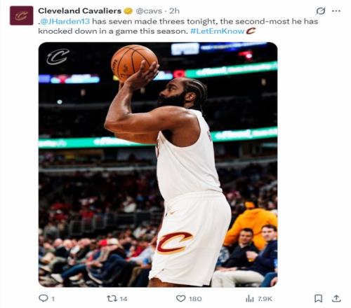 3.哈登此役單場(chǎng)命中7個(gè)三分球是賽季第二高,也是騎士生涯新高;