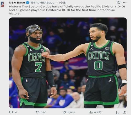 凱爾特人本賽季面對太平洋賽區的球隊,豪取10勝0負,完成了橫掃。這是凱爾特人1946年建隊以來,第一次橫掃整個太平洋賽區。這個賽區的球隊大家很熟悉:勇士、快船、湖人、太陽和國王。除了國王之外,其余球隊實力并不弱。