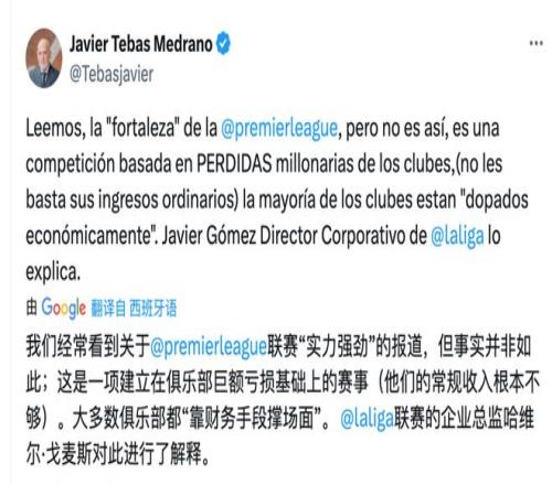 對于英超聯賽在轉會市場上的高舉高打,哈維爾-特巴斯一直略有微詞。“人們所談論所謂的「英超聯賽實力強勁」其實并非如此。這是一項建立在各俱樂部巨額虧損之上的賽事(他們的常規收入不足以支撐日常運營),大多數俱樂部都在靠財務手段撐面子。”2023年年初,哈維爾-特巴斯在個人推特賬號上就對英超的商業模式進行過批評。