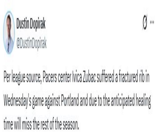 北京時間3月20日,據步行者隊記多皮拉克報道,步行者中鋒祖巴茨在周四不敵開拓者的比賽中肋骨骨折,將因傷缺席本賽季剩余所有比賽。