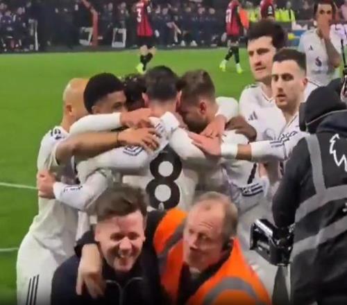 一球迷在曼聯(lián)球員慶祝時混入其中和B費(fèi)擁抱,達(dá)洛特神情疑惑