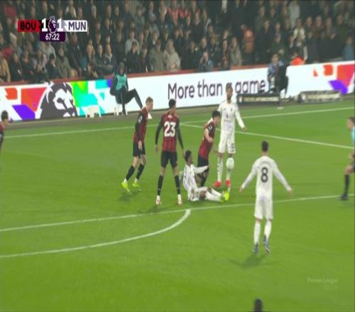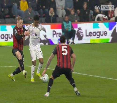 當時,1-0領先的曼聯攻入伯恩茅斯禁區,布魯諾·費爾南德斯妙傳阿馬德·迪亞洛,后者順勢帶入禁區,在阿德里安·特魯弗爾又拉又推之下倒地了。主裁斯圖爾特·阿特維爾沒有吹犯規,伯恩茅斯得球反擊,并且取得進球。