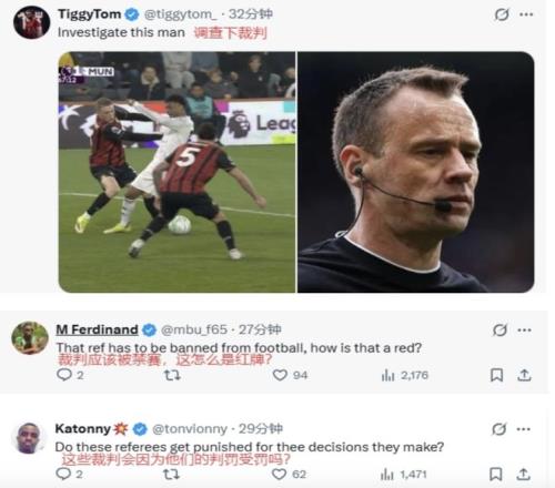 曼聯球迷則在英超官方賬號下面留言,表示裁判應該被禁賽,要求徹查裁判。