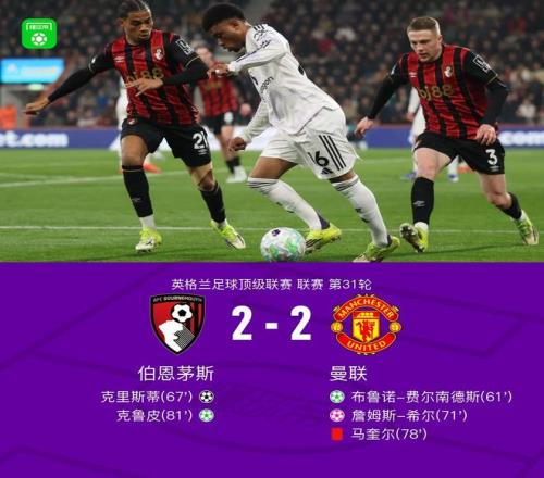北京時間3月21日英格蘭足球頂級聯賽 聯賽 第31輪,伯恩茅斯主場對陣曼聯。伯恩茅斯克里斯蒂破門,克魯皮破門,詹姆斯-希爾自擺烏龍。曼聯布魯諾-費爾南德斯破門。最終比分伯恩茅斯 2-2 曼聯。