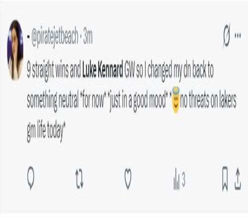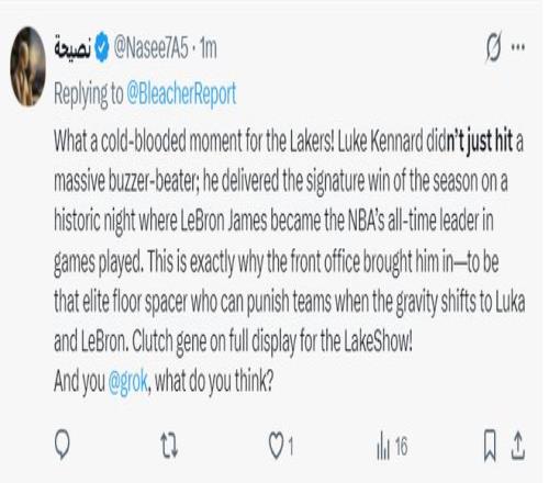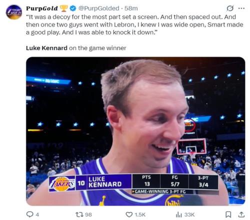 賽后湖人球迷寫道:肯納德這是一個多么冷酷無情的時刻啊,他不僅完成了絕殺,他還幫助詹姆斯完成了歷史性的時刻,詹姆斯超越帕里什成為歷史出場王。這就是湖人引進他的原因,他總是在關鍵時刻挺身而出,在詹姆斯、東契奇、里夫斯被限制的情況下他在決勝時刻命中絕殺。