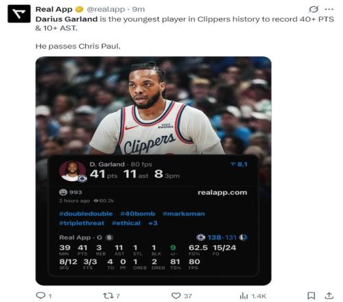 5.加蘭成為快船隊史最年輕的40+10助攻先生超越保羅;
