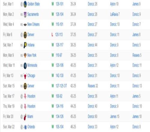湖人目前正值一波九連勝,東契奇場均出戰 37.5 分鐘,拿到 40 分 8.4 籃板 7.4 助攻 2.6 搶斷 0.9 蓋帽,投籃命中率 49%,三分命中率 40.3%。他成為張伯倫后首位9連勝期間能場均拿到至少40分以上的球員。