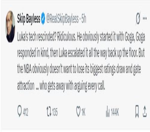 ‘金牌詹黑’斯利普-貝勒斯對東契奇被取消技犯很不滿,他表示:盧卡的技術犯規被取消了?太荒謬了,明顯是東契奇先挑釁比塔澤的,比塔澤只是以牙還牙而已,之后東契奇還一路升級沖突。NBA為了票房、收視率對每個吹罰都有自己的解釋方法。