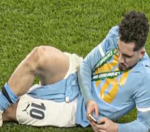 在今天凌晨進行的英聯杯決賽中,曼城2-0擊敗阿森納奪冠,賽后的照片可以看到,在頒獎典禮結束后,謝爾基在球場內躺著玩手機。