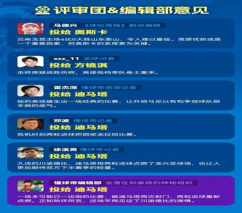 大家好,歡迎來到懂球帝2026賽季中超MVP的評選現場。本賽季的第3輪MVP評選中,在川渝德比中梅開二度的迪馬塔以36.5%的得票率反超王鈺棟(33.3%)成功當選本輪MVP。這是迪馬塔第1次當選懂球帝中超MVP。