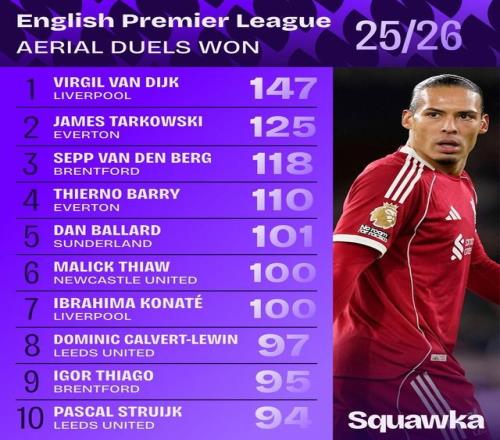 北京時間3月24日,知名數據機構Squawka統計出了本賽季至今英超成功爭頂次數最多的10名球員,范戴克147次斷檔領先,塔爾科夫斯基125次第2,馬利克-佳夫和科納特上榜。