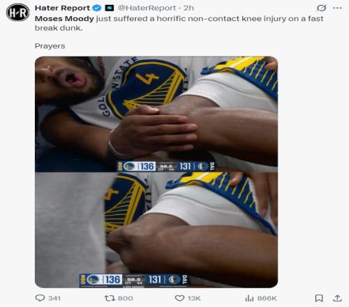 北京時間3月24日,剛剛傷愈復出的摩西-穆迪再度遭遇了毀滅性的傷病,他在加時賽一次快攻中無對抗左膝反關節,場面觸目驚心勇士與獨行俠的一些球員甚至看哭了,庫里戴著大金表捂頭沮喪。