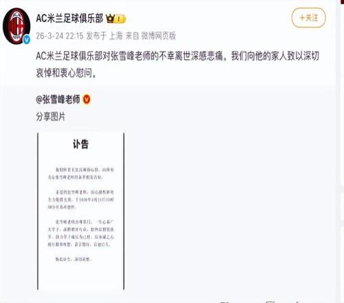 張雪峰訃告發布后,意大利AC米蘭俱樂部官方社媒表示:“AC米蘭足球俱樂部對張雪峰老師的不幸離世深感悲痛。我們向他的家人致以深切哀悼和衷心慰問。”