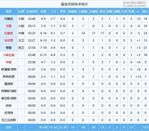 掘金隊:約基奇23分17板17助、穆雷21分1板6助、小哈達威18分3板2助、戈登16分6板3助、約翰遜14分3板2助、布勞恩13分3板1助、布朗9分9板3助、斯特勞瑟7分1板1助