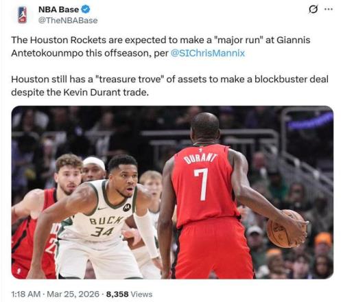 《體育畫報》名記Chris Mannix跟進曝出,火箭隊預計將在休賽期全力追求超級巨星字母哥。