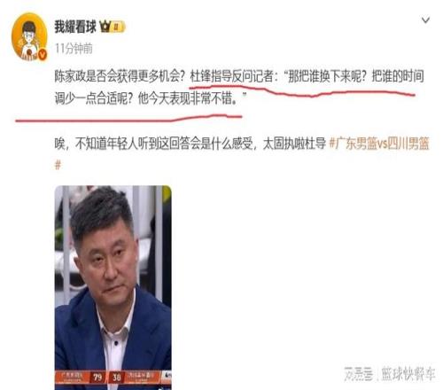 本場比賽,廣東隊小將陳家政狀態火爆,出戰13分鐘,便7投6中,砍下20分。可在談到陳家政以后會不會獲得更多登場時間時,杜鋒竟然直接反問記者:“那把誰換下來,應該把誰的時間調少一點合適?”很顯然,在杜鋒的戰術體系里,胡明軒、杜潤旺和張皓嘉,依舊比陳家政重要。這一場比賽,胡明軒得到3分,而張皓嘉出戰37分鐘,卻只拿到5分,可他們的出場時間,卻比陳家政穩定的多。