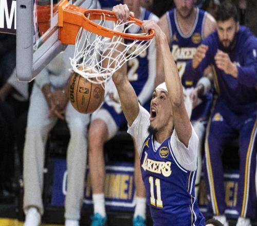 次節回來,海斯搶下前板二次進攻放籃得手,詹姆斯行進間頂開沃克,隨后沖框再次單臂隔扣胡夫,一場隔扣兩個真是狠,湖人領先步行者已經多達21分。杰-胡夫反擊加速暴扣得手,找回點面子,詹姆斯輕松寫意背傳精準找到拉拉維亞 助后者輕松上籃打中,分差來到24分。內史密斯三分線外搭弓射箭命中,托平快攻再送精彩暴扣,步行者追到11分分差。范德比爾特側翼接球,踩線長兩分洞穿籃心,半場戰罷,湖人以75-59領先步行者16分。