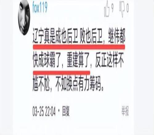 球迷說,誰給你的信心?瘋狂打鐵為何不收手?為何繼續(xù)浪投?球迷說得也有道理。如果趙繼偉在命中率低的情況下,能有意識(shí)地減少出手,多給隊(duì)友創(chuàng)造機(jī)會(huì)也許不會(huì)輸?shù)舯荣悺G蛎耘瓏姡斑|寧真是成也后衛(wèi)敗也后衛(wèi),繼偉都快成球霸了,重建算了”,還有球迷調(diào)侃:14中1,吉林慶功宴紀(jì)委不動(dòng)筷子都不能吃。確實(shí),趙繼偉成了吉林隊(duì)的臥底。