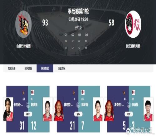 在剛剛結束的一場WCBA季后賽中,山西竹葉青酒主場93-58輕取武漢盛帆黃鶴,取得開門紅。