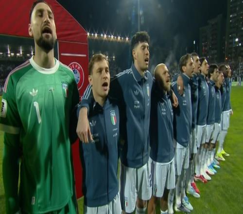 體育播報04月01日宣 意大利vs波黑即將開打,賽前,意大利眾將士,以及主教練加圖索、領隊布馮高唱國歌。