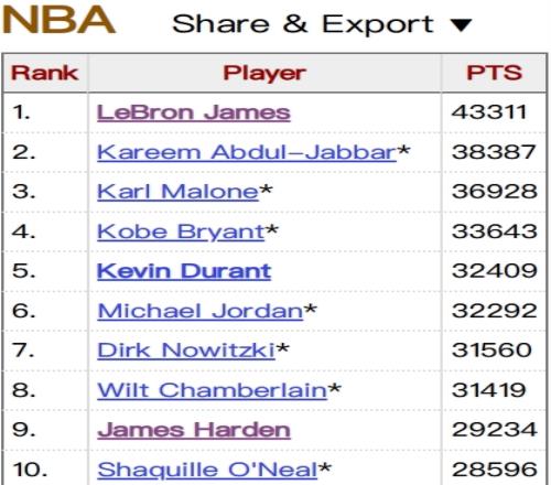 他的職業生涯總得分已經來到43311分,距離領先歷史得分榜第二名的賈巴爾5000分僅差76分。