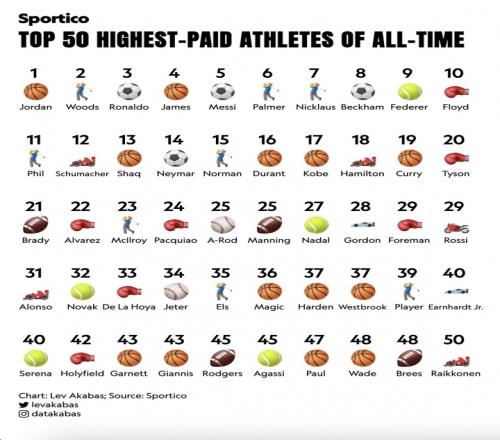 完整TOP50排名(依次為球員、領(lǐng)域、考慮通貨膨脹調(diào)整后的收入、未經(jīng)調(diào)整的收入,單位為美元):