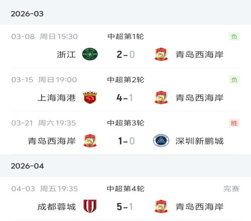 體育播報04月03日宣 伴隨著中超第四輪青島西海岸客場1-5不敵成都蓉城,鄭智執(zhí)教西海岸前四場的戰(zhàn)績來到1勝3負,球隊進3球丟11球。