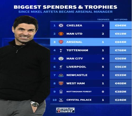 從2020年1月到現(xiàn)在花了近10億歐元買人,阿爾特塔手里只有一個(gè)冠軍(2019/20賽季足總杯)。這不僅落后于切爾西和曼聯(lián),跟利物浦(5個(gè))和曼城(9個(gè))更是沒法比。