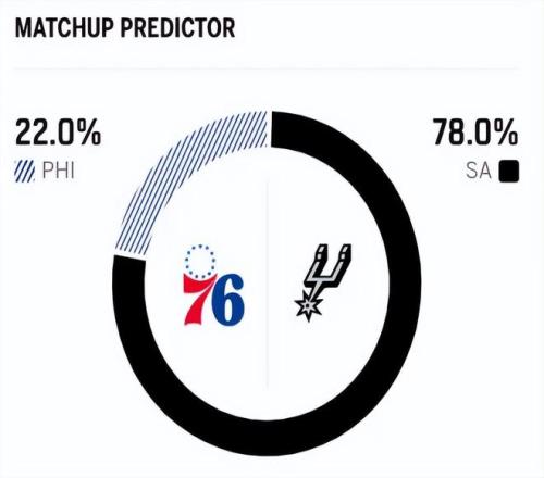 賽前,美媒ESPN對本場比賽進(jìn)行了勝率預(yù)測,馬刺隊(duì)勝率高達(dá)78.0% ,76人勝率則僅有22.0% ,差距非常明顯。