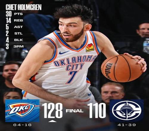 這場比賽,雷霆球星切特霍姆格倫打出了本賽季最佳之一:全場出戰31分鐘,投籃13中10,三分4中3,罰球10中7,得到30分14籃板5助攻。