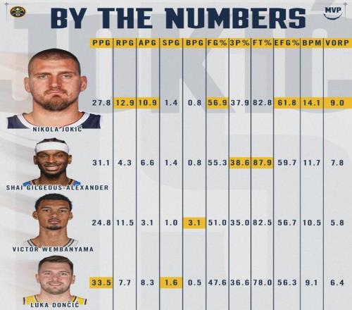 掘金官方今天曬出四個MVP候選人的數(shù)據(jù)對比,在這四個人當(dāng)中,約基奇場均籃板、助攻、投籃命中率、有效命中率、基礎(chǔ)正負值和不可替代值六項數(shù)據(jù)領(lǐng)先。亞歷山大三分和罰球命中率領(lǐng)先,東契奇場均得分和搶斷領(lǐng)先,文班場均蓋帽領(lǐng)先。