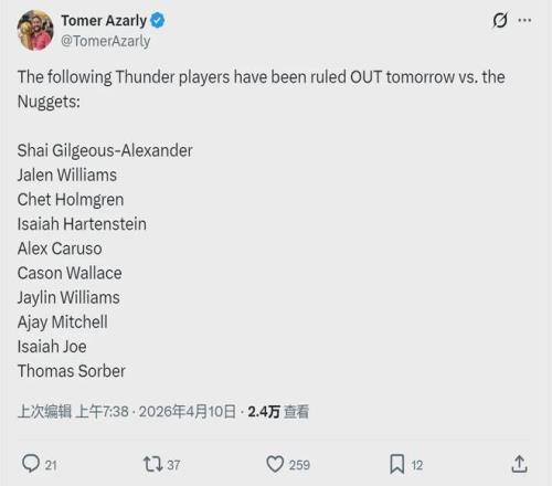 北京時間4月10日,雷霆官方更新了球隊傷病報告,明天對陣掘金,雷霆有10人休戰(zhàn):