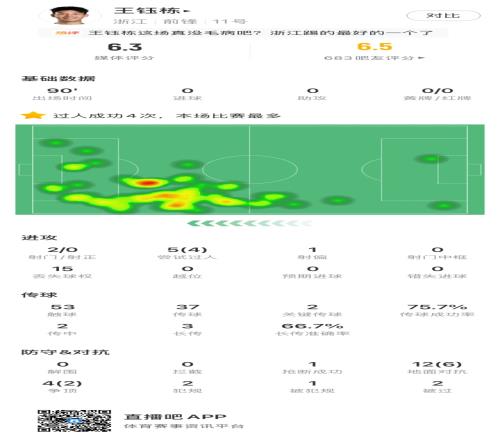 賽后數據顯示,王鈺棟本場5次嘗試過人4次成功,為全場最多。但2次射門均未射正,丟失球權15次,傳球成功率75.7%。鋒線搭檔瓜里拉帕則是僅有1次射門。