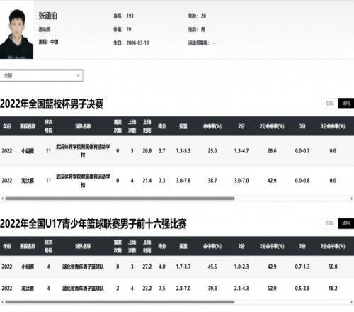 籃協官網比賽記錄也佐證了這一點,張涵泊在19年和21年參加了兩次U15的賽事,19年表現平平,但21年明顯數據全面提升。