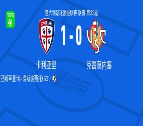 北京時間4月11日意大利足球頂級聯賽第32輪,卡利亞里主場迎戰克雷莫內塞。比賽中,卡利亞里球員塞巴斯蒂亞諾-埃斯波西托攻入制勝球。最終比分定格為卡利亞里1-0克雷莫內塞。