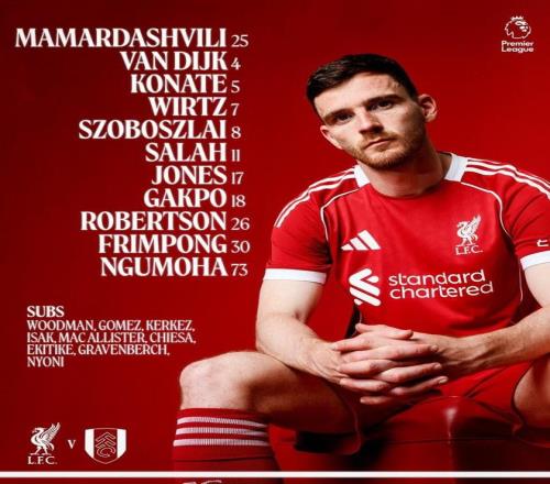 利物浦首發:25-馬馬爾達什維利、30-弗林蓬、5-科納特、4-范戴克、26-羅伯遜、17-柯蒂斯-瓊斯、7-維爾茨、8-索博斯洛伊、18-加克波、11-薩拉赫、73-恩古莫哈