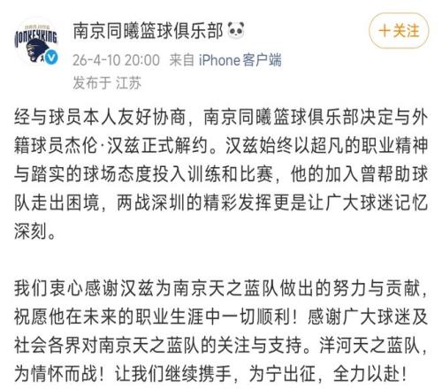 所以,為了J.Cole能正兒八經上場,南京還裁掉了外援 杰倫·漢茲。(南京之前已經有四位外援了)