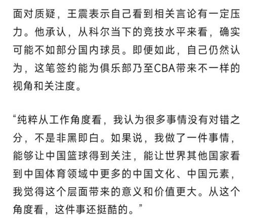 王震表示他承認J.Cole當下的競技水平確實不如職業球員,但即便如此,這筆簽約能為俱樂部乃至CBA帶來不一樣的關注度。