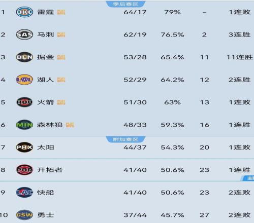 掘金目前以53勝28負位列西部第三,湖人52勝29負第四,火箭51勝30負第五,森林狼48勝33負第六。