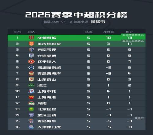 中超第5輪結束,成都蓉城客場2-1絕殺北京國安,目前積13分繼續排名榜首,重慶銅梁龍和云南玉昆同樣贏球,繼續位列2、3位。此外,上海申花在德比戰中擊敗上海海港,積分成功轉正。
