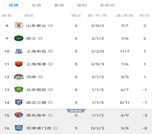 體育播報04月12日宣 2026賽季開局中超9隊被罰分,目前9支球隊已全部結束前五輪賽程。5隊轉正4隊仍負分,津門虎五輪不勝積-8分墊底。