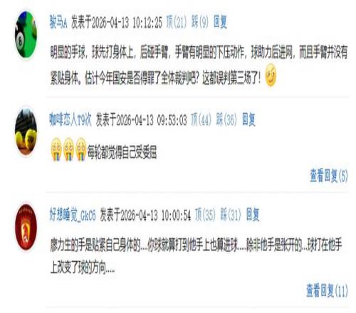 有球迷表示,明顯的手球,球先打身體上,后碰手臂,手臂有明顯的下壓動作,球助力后進網,而且手臂并沒有緊貼身體,估計今年國安是否得罪了全體裁判吧?這都誤判第三場了!還有球迷表示,廖力生的手是貼緊自己身體的….你球就算打到他手上也算進球…..除非他手是張開的……